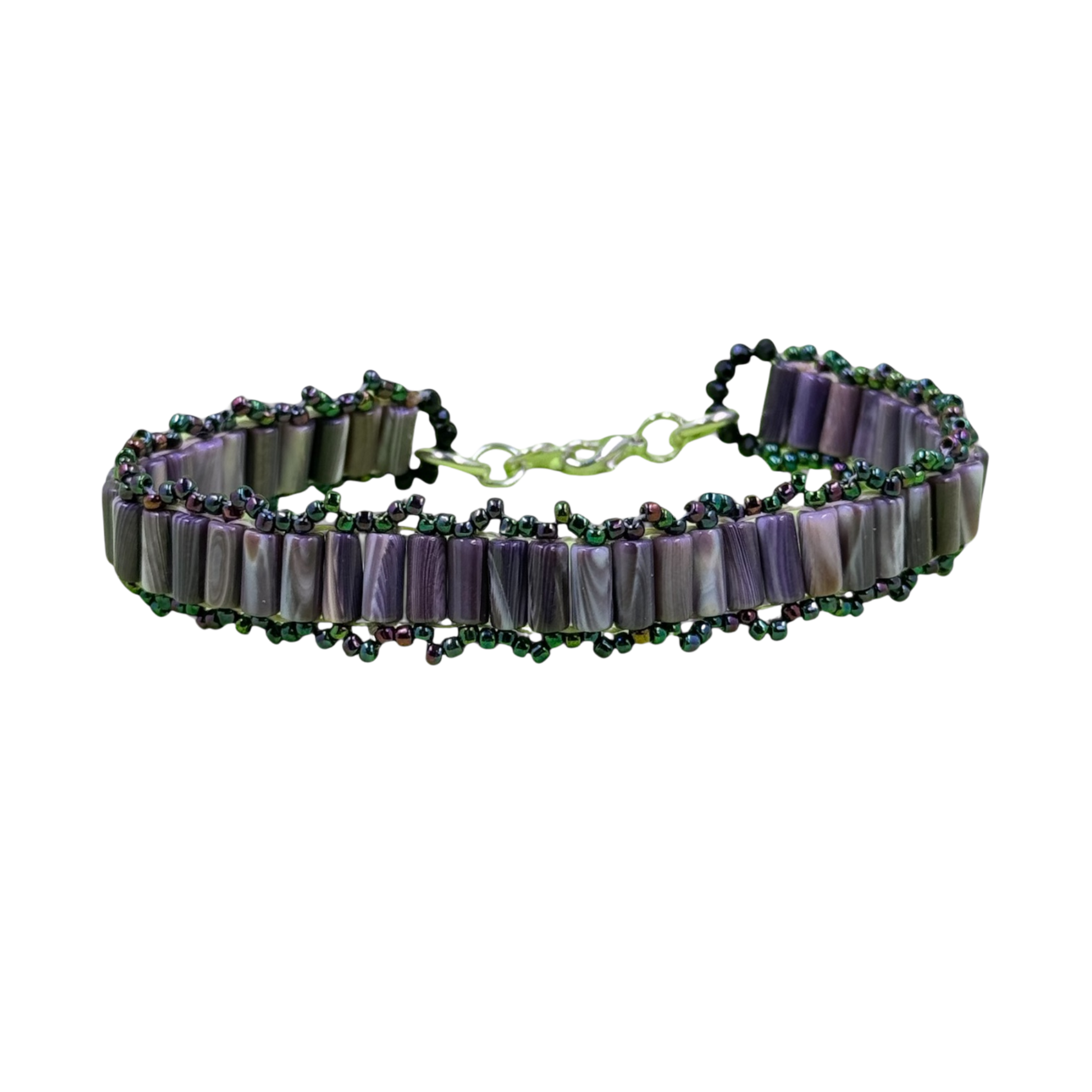 - Single row, purple Wampum bead bracelet with seed beads & green tone surgical steel findings.